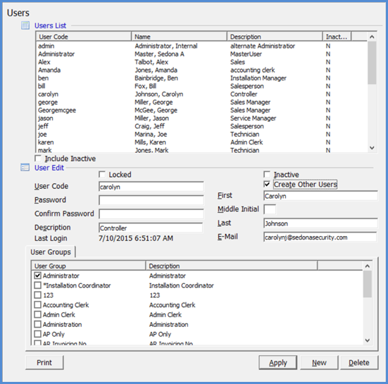 Setting up a Users is a two-step process. First you will create the User record, and then you will assign the User to one or more User Groups. The User Group will determine which modules and which functions within each module to which the User will have access. Anyone you wish to give access to SedonaOffice must be setup as a User. The password entered for each user is encrypted; if a user forgets their password, the company’s system administrator will need to change or re-enter and save the password here in SedonaSetup.
