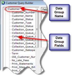 2. The CQB Query Design form will be displayed. Expand the tree of the first Data Group that contains fields that will be listed on the report. To expand a Data Group the User may either press the “+” to the left of the Data Group or double-click on the Data Group name.