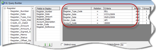 For the fifth filter, drag and drop the Account_Code field from the Account Data Group into the Filter area. Again the Relation field will default to “=”; do not change this selection. In the Criteria column select your company's Accounts Payable account number (typically 20000) from the drop-down list then press the tab key on the keyboard.